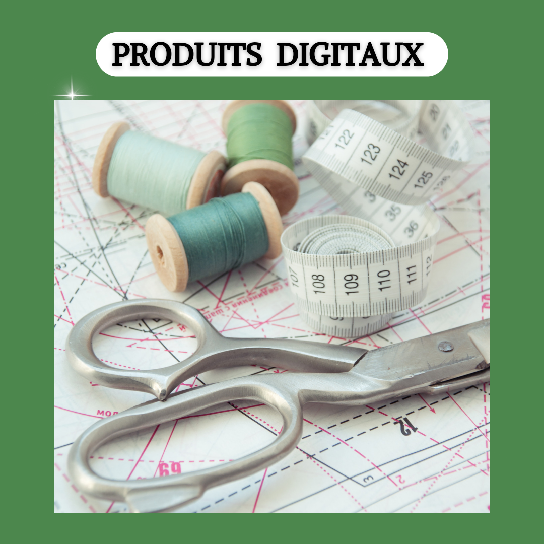 Ici tu retrouveras des produits digitaux tels que e-books, matériel de travail pour améliorer ta couture, les croquis de mode pour matérialiser tes idées et bien plus encore...